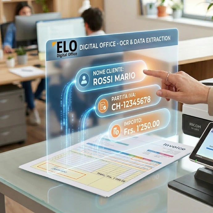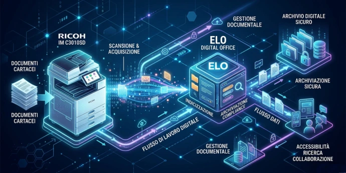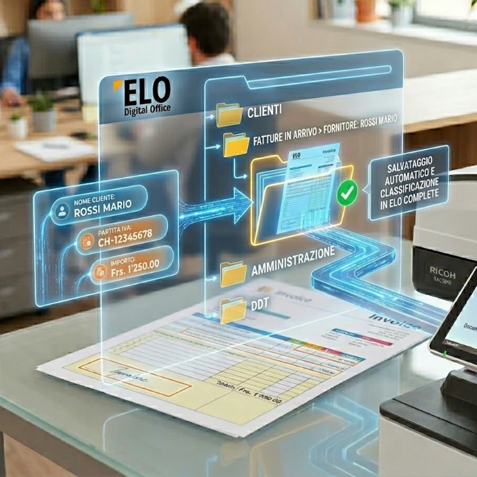 La nostra soluzione nasce dall'integrazione perfetta tra hardware e software: combina la potenza di scansione delle Multifunzionali Ricoh con l'intelligenza gestionale di ELO Digital Office.