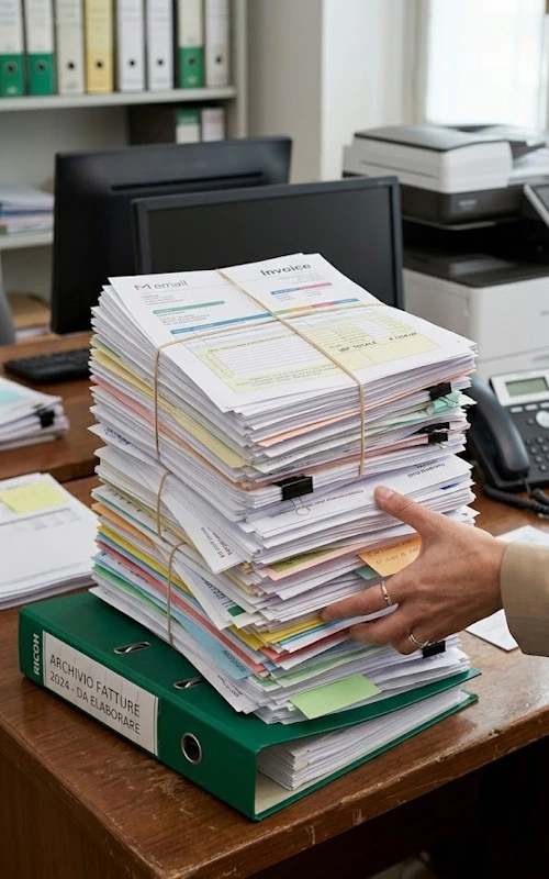 Un tavolo sommerso di carta e una casella email intasata. L'impiegato inserisce manualmente ogni dato nel gestionale, con il rischio costante di errori di battitura o pagamenti duplicati. Cercare una fattura dell'anno scorso significa andare in archivio e perdere 20 minuti tra i raccoglitori.