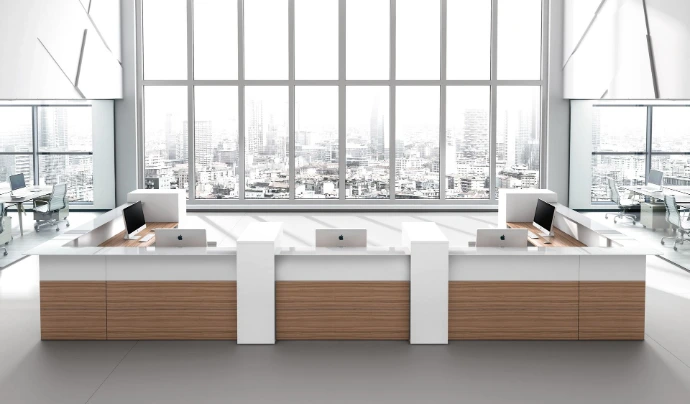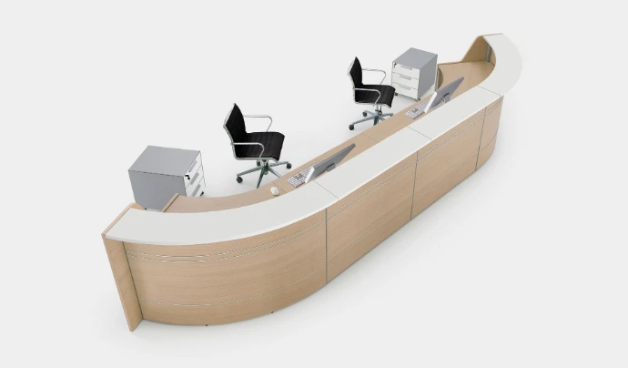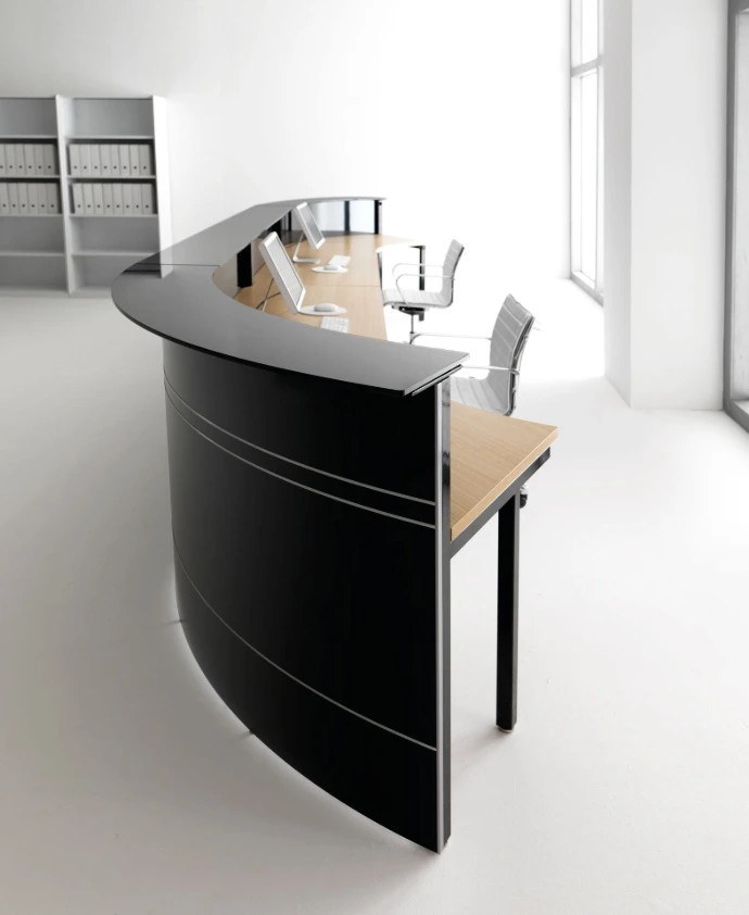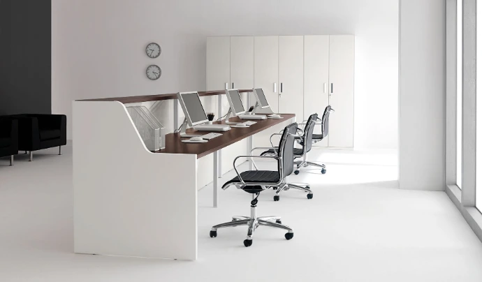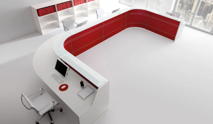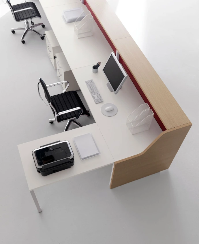 Il bancone è l'elemento più personalizzabile dell'ufficio. Attraverso l'uso di retroilluminazione a LED, l'inserimento del logo aziendale e la scelta di materiali che richiamano i colori del brand, possiamo trasformare il bancone in un potente strumento di marketing visivo.