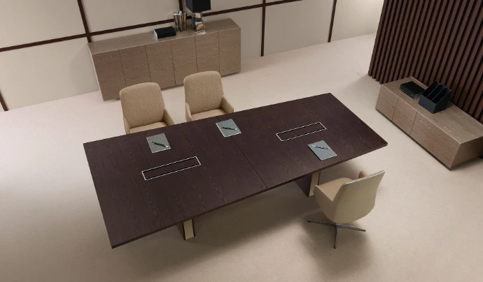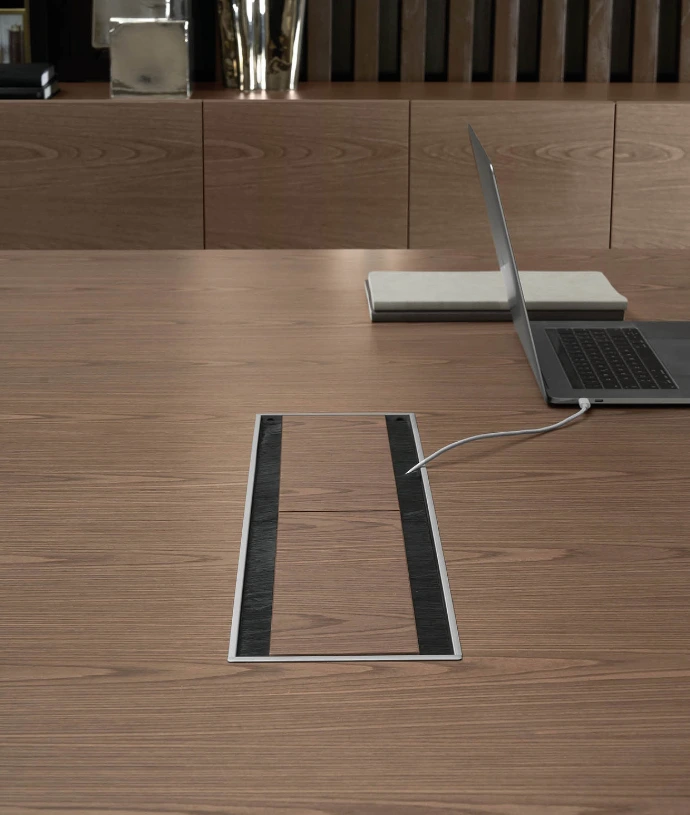 Tavoli Multimediali: Piani d'appoggio eleganti che nascondono sistemi di connettività avanzati (plug-and-play), per collegare ogni dispositivo in pochi secondi senza cavi a vista.